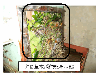 環境処理センターで操作して初めて弁の詰まりに気付きます。係員が出向き、貯留排出機に入り、初めて「草木の詰まりが原因」だとわかります。手作業で草木を取らなければなりません。