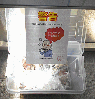 ●解決:現在は取り除いて,パイプラインは通常に使用できる状態 なお、マンション掲示板に注意書きポスター掲示